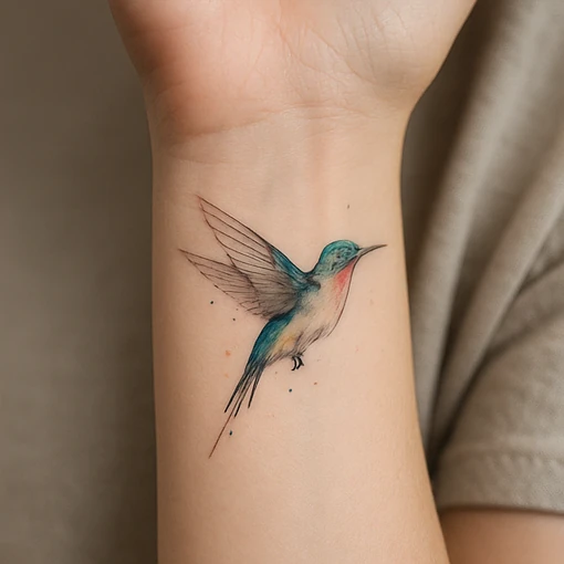 Hummingbird tattoos symbolize joy, energy, and resilience. They represent love, positivity, and adaptability. The hummingbird embodies agility and freedom. A hummingbird tattoo highlights the wearer’s ability to find happiness, navigate challenges lightly, and spread optimism while appreciating life’s small pleasures and fleeting moments.