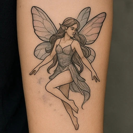 Fairy tattoos symbolize magic, playfulness, and connection to nature. They represent freedom, curiosity, and mystical transformation. The tattoo highlights joy, imagination, and ethereal qualities. A Fairy tattoo conveys the wearer’s fascination with wonder, enchantment, and the blending of natural and magical worlds.