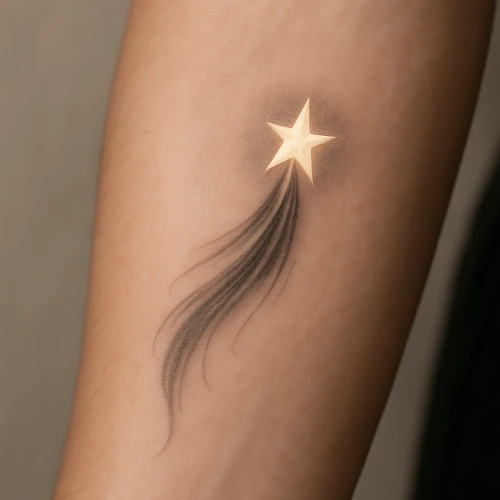 Shooting Star tattoos symbolize inspiration, aspiration, and wonder. They represent transience, opportunity, and action. The tattoo highlights ambition, motivation, and cosmic fascination. A Shooting Star tattoo conveys hope, drive, and desire to reach personal goals.