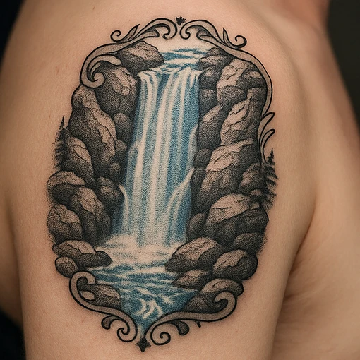 Waterfalls tattoos symbolize flow, renewal, and tranquility. They represent patience, strength, and adaptability. The tattoo highlights resilience, natural cycles, and inspiration from nature’s beauty. A Waterfalls tattoo conveys calm, personal growth, and life’s continuous movement.