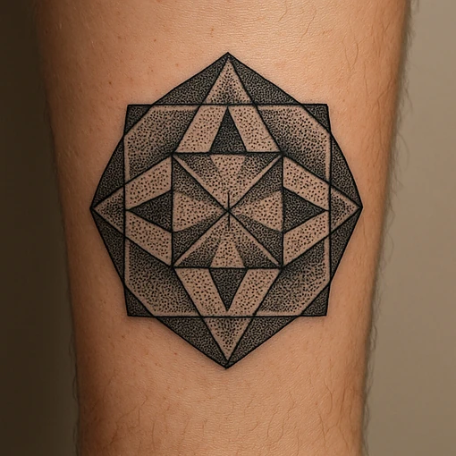 An octagon tattoo symbolizes structure, stability, and protection. It reflects symmetry, endurance, and balance in design. Often chosen for its unique form, it represents resilience and rational strength. This tattoo embodies harmony, stability, and the beauty of structured geometry with protective qualities.